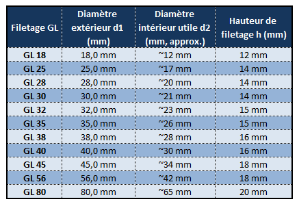 - Type : Norme de filetage GL (Gewinde Labor, filetage laboratoire).