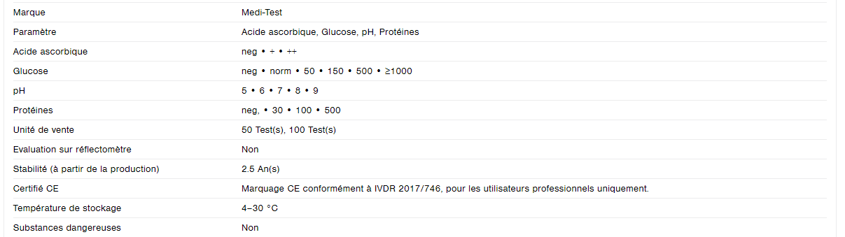 Bandelettes test urinaire : Acide ascorbique - Glucose - pH - Protéines - 50 bandelettes